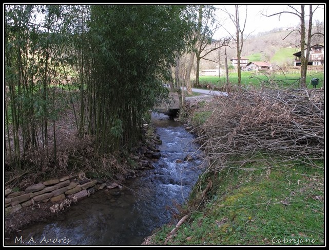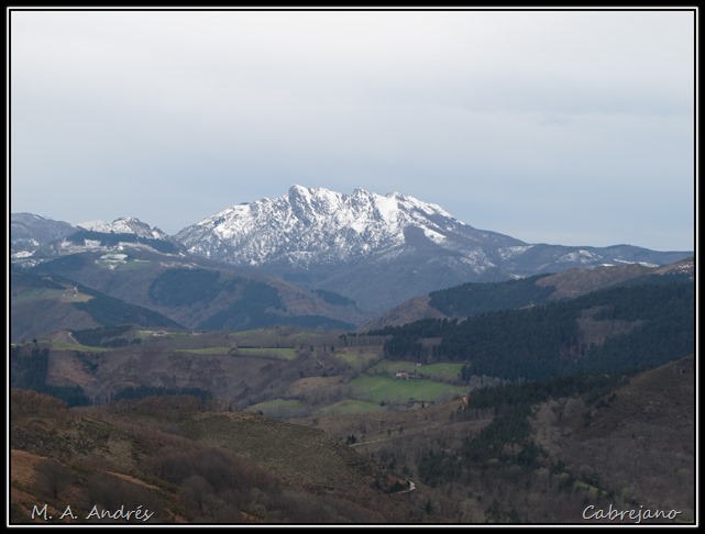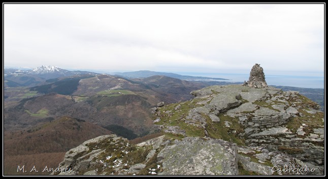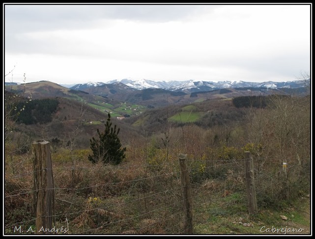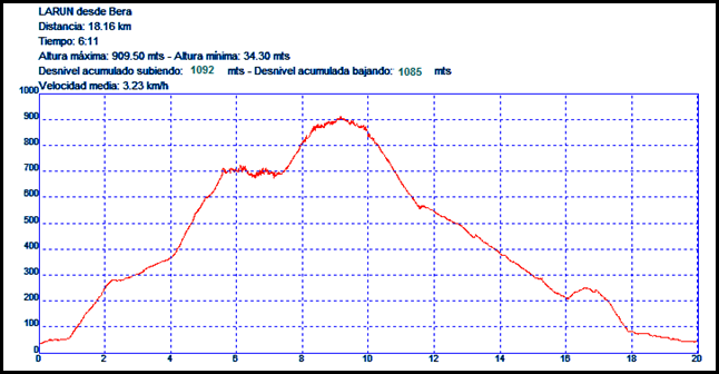 Paramos poco en la cima, mucho viento y frio, iniciamos la bajada por la pista y al poco de dar la primera curva, cogemos un camino que sale a la izquierda, que nos lleva hasta Maleteko borda, donde seguimos bajando por pista pasando por Arregi, Gaineko Bizkarra, Kaule, cruzamos la carretera que sube a Luzuniaga, y seguimos, ya por camino asfaltado, siguiendo las marcas de los pr llegamos de nuevo a Bera.